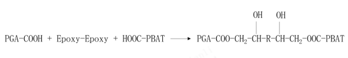 主要反应:通过环氧扩链剂Epoxy-Epoxy与PGA及PBAT的端羧基起开环反应,连接两者的分子链: