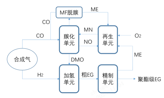 以合成气为原料,分离得到纯的CO和纯的H2。CO与来自酯化单元的亚硝酸甲酯MN在200-240℃、3.0-5.0bar条件下于Pd/Al2O3催化剂上发生羰化反应生成草酸二甲酯DMO,副产甲酸甲酯MF和NO。其中MF经脱羰单元分解成甲醇ME和CO,返回酯化系统再度利用;NO返回再生单元与O2和来自精致单元的甲醇ME发生酯化反应生成循环物质MN作为羰化单元进料。H2与羰化单元生成的DMO在180-200℃、2.6-3.3MPa条件下于Cu/SiO2催化剂上发生加氢反应生成粗乙二醇EG,再经精制单元处理后获得聚酯级EG,并回收甲醇返回再生单元。