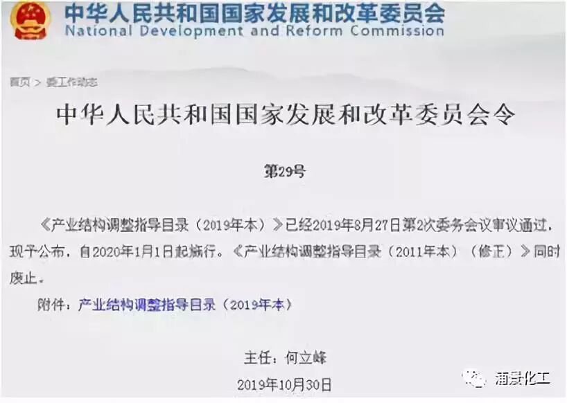2019年10月30日,国家发改委修订发布了《产业结构调整指导目录发布(2019年本)》自2020年1月1日起实施,原本《产业结构调整指导目录(2011年本)(修正)》同时废止。
